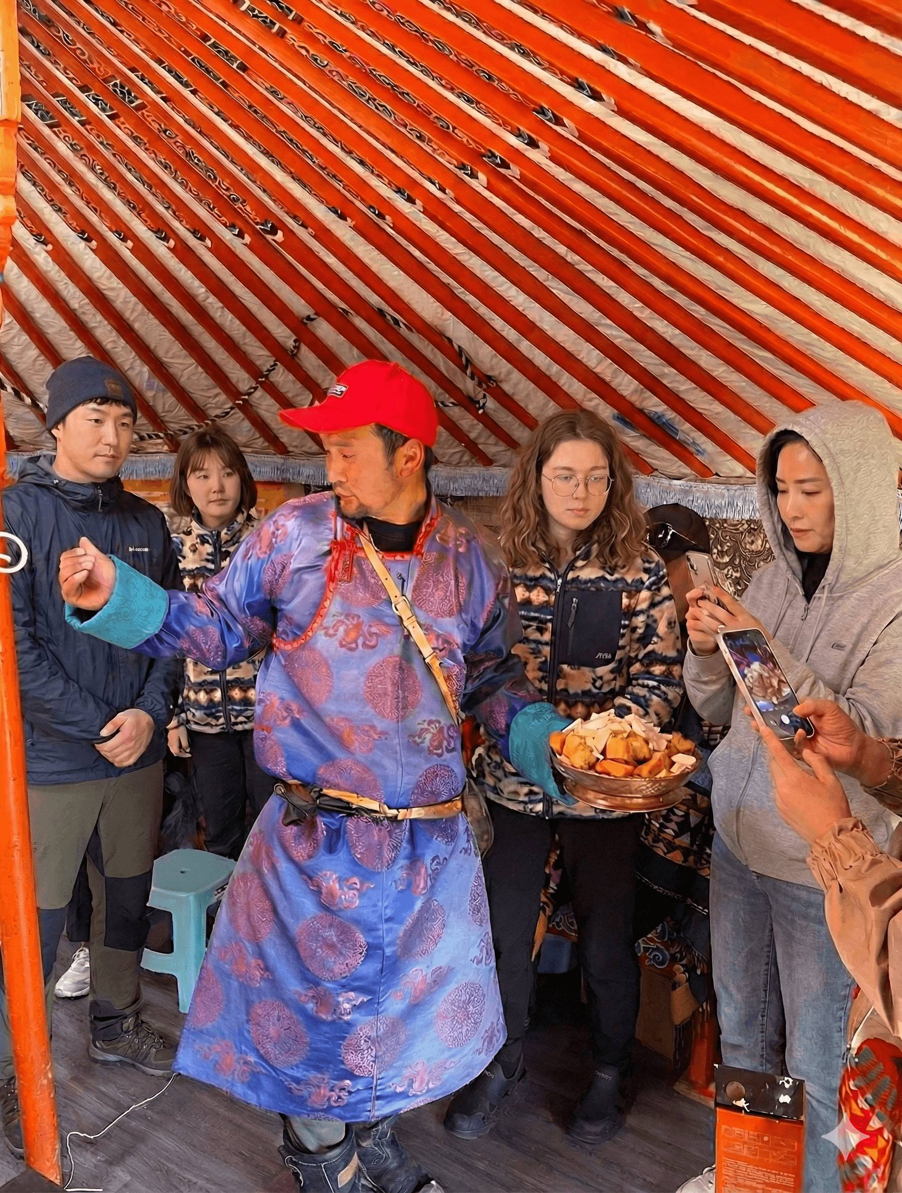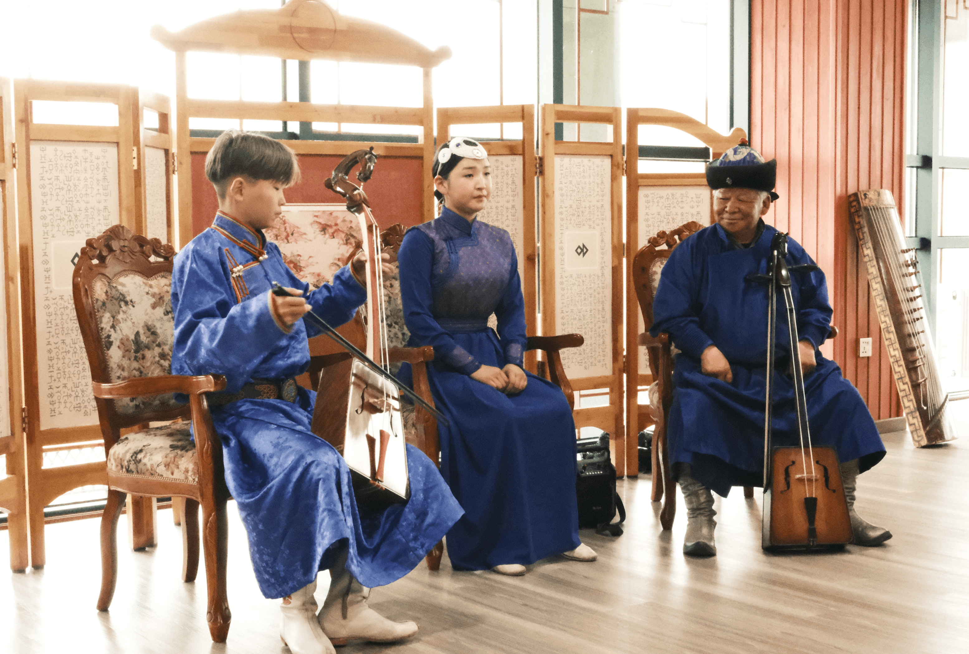 이 공연은 몽골의 전통 성악 기법인 **흐미(Khöömii)**를 기반으로, 초원의 노래와 몽골 전통 악기를 함께 연주하는 실제 유목민들의 전통 공연입니다. 공연을 진행하는 팀은 에르덴조 사원 인근에서 지금도 유목 생활을 이어가고 있는 가족 공동체로, 흐미 창법을 대대로 전수받아온 집안입니다. 무대용으로 연출된 공연이 아니라, 이들이 살아온 방식 그대로의 소리와 리듬을 여행자 앞에서 조심스럽게 들려줍니다. 초원의 공기, 울림이 남는 침묵, 그리고 사람의 목소리가 겹쳐지는 이 시간은 듣는 공연을 넘어 몽골의 삶과 전통을 ‘현장에서 마주하는 경험에 가깝습니다.