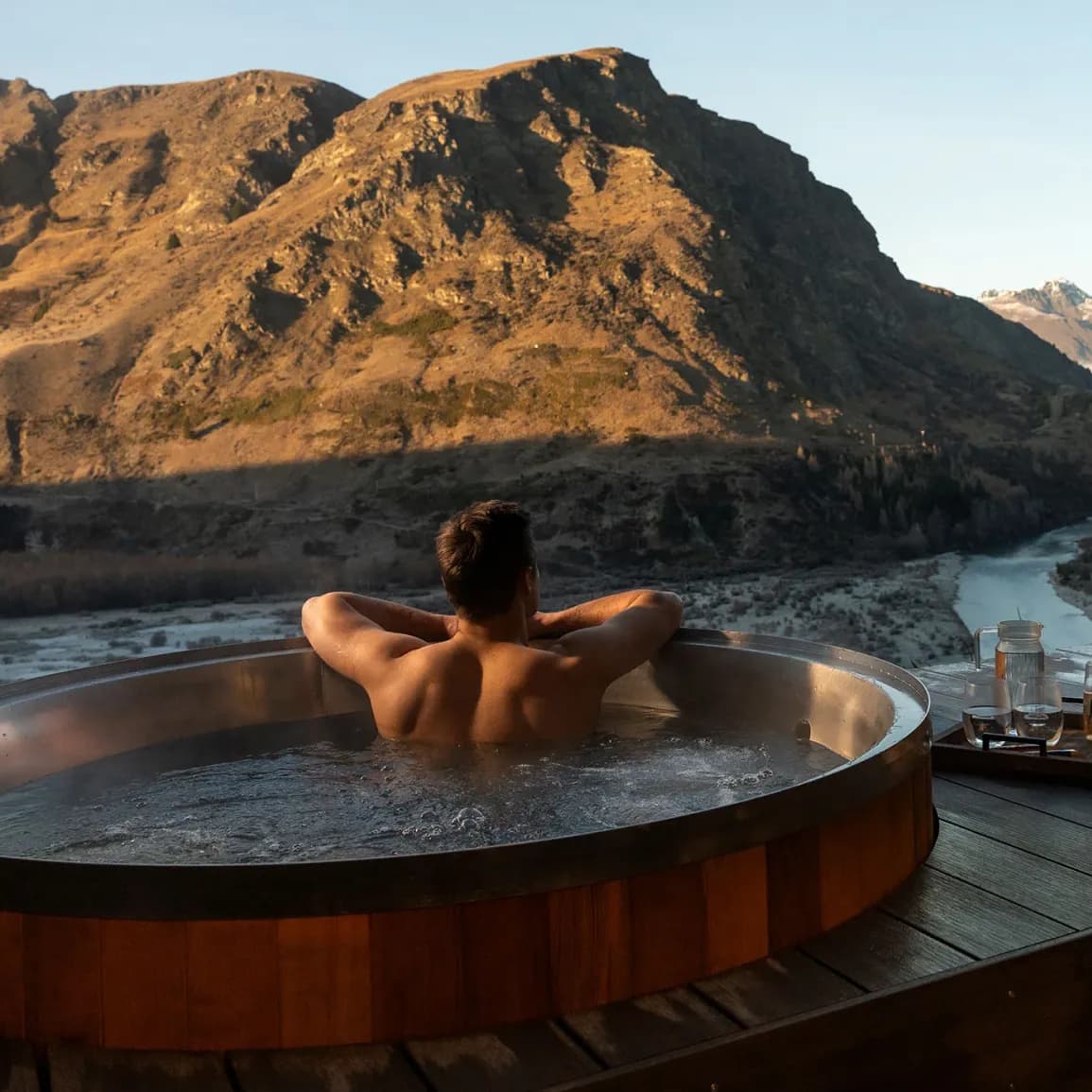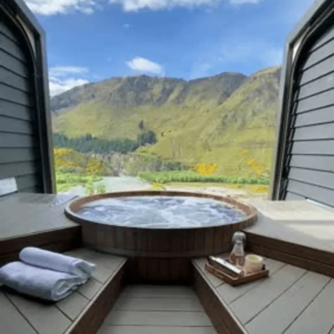 쇼트오버 강을 내려다보는 절벽 위에 위치한 프라이빗 온천입니다. 전망 좋은 통유리 욕조에서 뉴질랜드의 자연을 바라보며 따뜻한 물에 몸을 담그는 순간, 그야말로 완벽한 휴식이에요. 일몰 시간대엔 붉게 물든 하늘과 산이 함께 어우러져 가장 인기 있는 타임이랍니다.